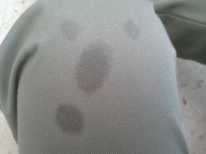 Pues no, no es el nuevo hit de Hanna Montana. ¡Es el nuevo fantasma que apareció ayer en mi pantalón! Estaba tomándome un té cuando, como de costumbre, apoyé la taza mojada sobre mi rodilla. El azar hizo el resto. Sin duda, es el ser más efímero que me he llegado a encontrar. Apenas tuve tiempo de decirle hola, sacar la cámara del móvil y echarle una instantánea. Para entonces, ya sus ojillos comenzaban a desdibujarse. Pero él feliz con su narizota y esa cara mezcla de sorpresa y satisfacción. «Total, ya apareceré en la rodilla de otro», debió pensar.